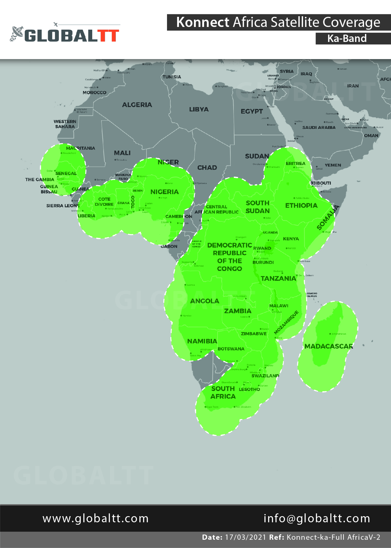 Satellite Konnect KA Ka Band Detailed Chart Examples of Countries covered Angola Benin Burundi Cameroon Congo DRC Gambia Ghana Ivory-Coast Kenya Malawi Nigeria Rwanda Togo Zambia Zimbabwe Get more info
